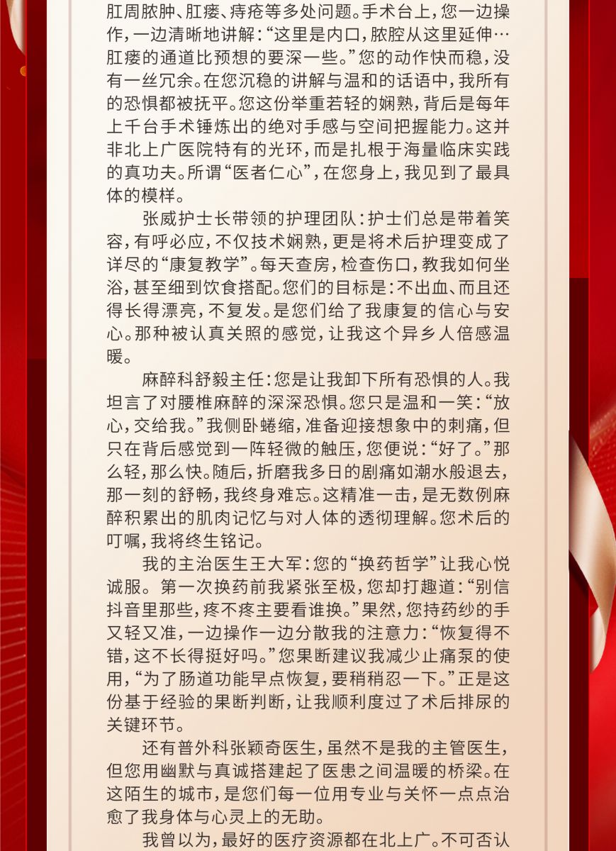 张威护士长带领的护理团队:护士们总是带着笑容,有呼必应,不仅技术娴熟,更是将术后护理变成了详尽的“康复教学”。每天查房,检查伤口,教我如何坐浴,甚至细到饮食搭配。您们的目标是:不出血、而且还得长得漂亮,不复发。是您们给了我康复的信心与安心。那种被认真关照的感觉,让我这个异乡人倍感温暖。