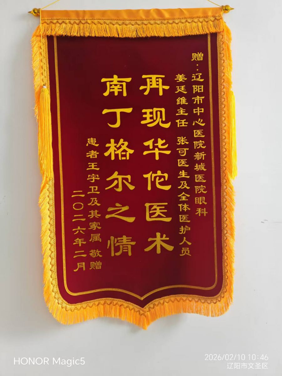 近日,辽阳市中心医院新城医院眼科上演了温馨一幕:患者王先生及家属将锦旗和感谢信,送到了姜延维主任、张可医生及科室全体医护人员手中。这不仅仅是对两次成功手术、重获光明的感谢,更是对医护人员拒收红包、将款项转为住院费的高尚医德的深深致敬。