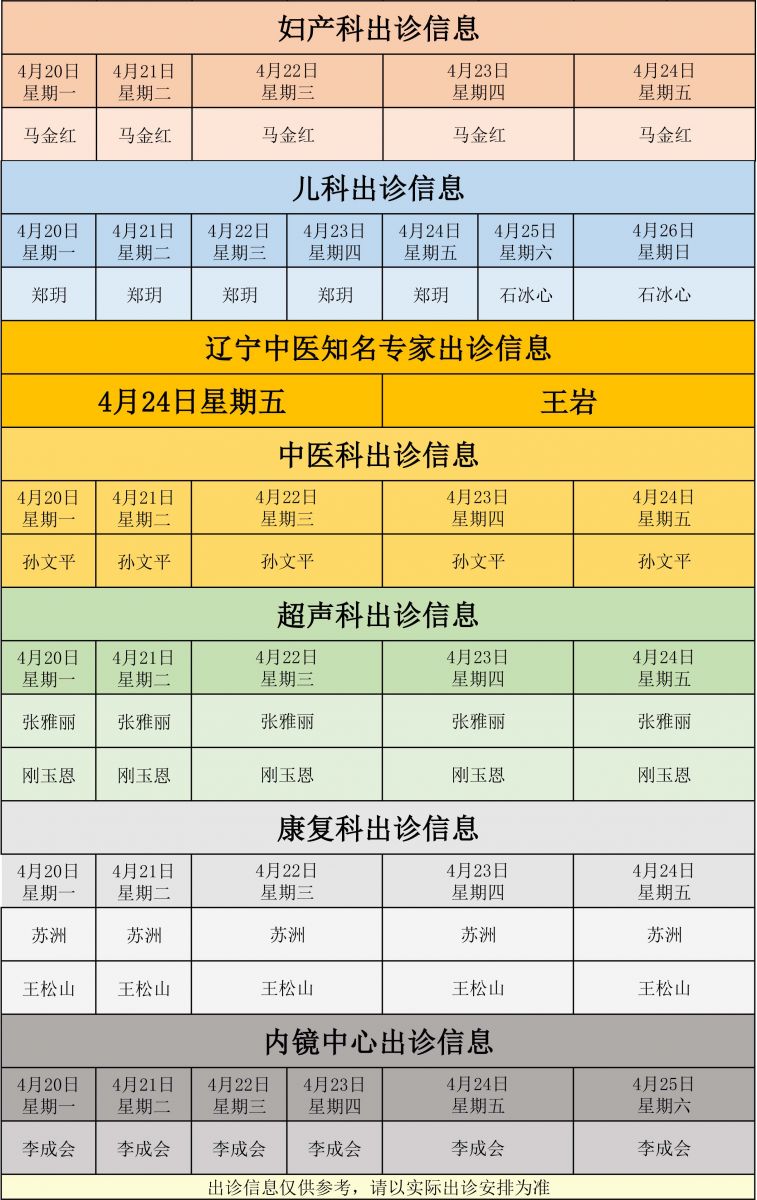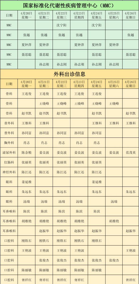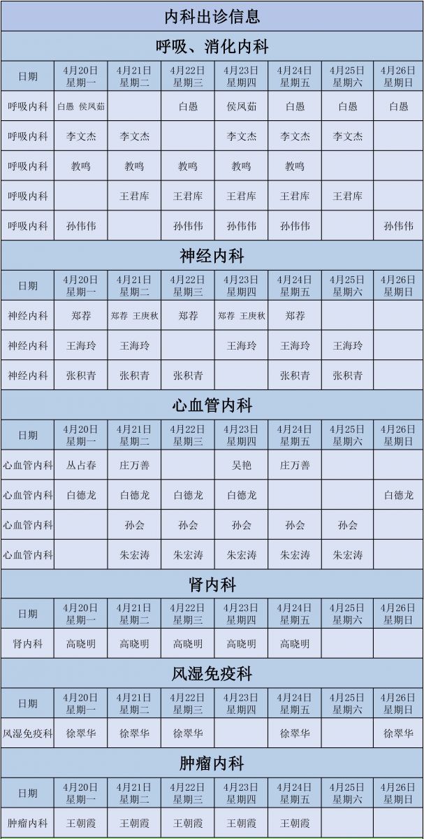 新城医院4月20日至4月26日门诊出诊信息